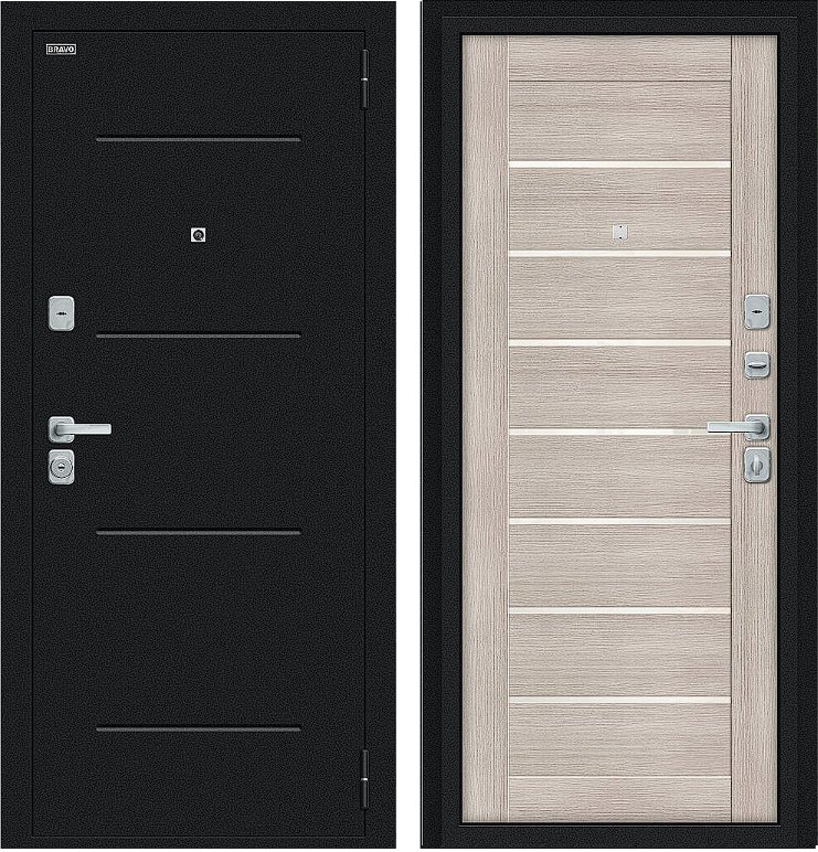 Надежная входная Дверь Браво Техно/BChrome Букле черное/Cappuccino Melinga премиум класса по цене 33 063 руб. Большая толщина стали защитит от проникновения в ваш дом, квартиру или коттедж. Используется очень качественная фурнитура: замки, цилиндры, ручки, защелки. Покрытие и отделка двери изготовлено под внимательным контролем производителя. Дверь имеет долгий срок службы и гарантию.